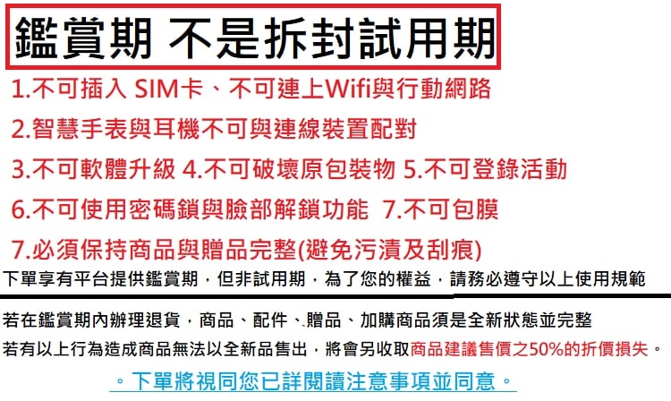 請先確認商品規格是否正確在進行拆封。本商品為特定 3C 產品,寄送包裝外盒膠膜或封條一經拆封/保固啟用/序號經登入註冊,該產品恕無法退換貨。若需退貨,將會另外收取 50% 折價損失,若有其他損壞(商品刮傷。外盒包裝損毀)或缺少配件贈品將依損壞情況或缺件商品價格索取費用,謝謝您。