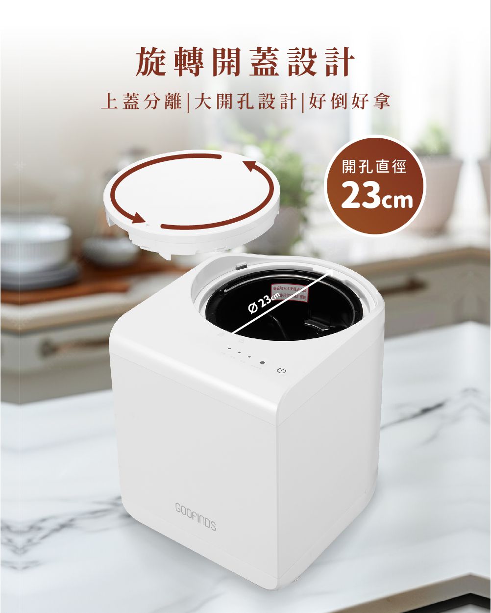 超大23公分開孔,讓您在傾倒食物,廚餘垃圾時更方便快速,不怕溢出造成環境髒亂