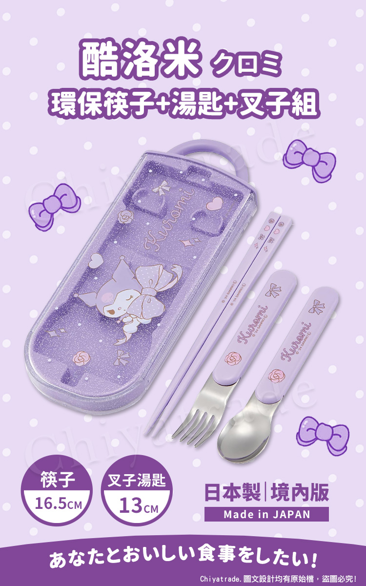 【百科良品】日本製 Kuromi酷洛米 紫萌 蝴蝶結 環保筷子+湯匙+叉子三件餐具組 抗菌加工Ag+(日本境內版)