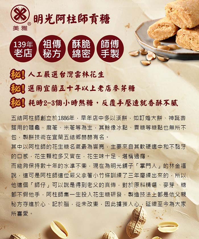 「明光阿柱師」不是名字,而是一種信任的印記。從阿公的手中接棒,到今日傳承三代,我們用時間與雙手,延續一塊貢糖的香氣與溫度。這不是速食的年代產品,而是用心與歲月打磨出的台灣味。