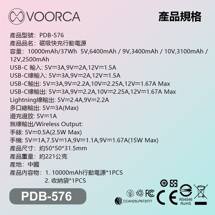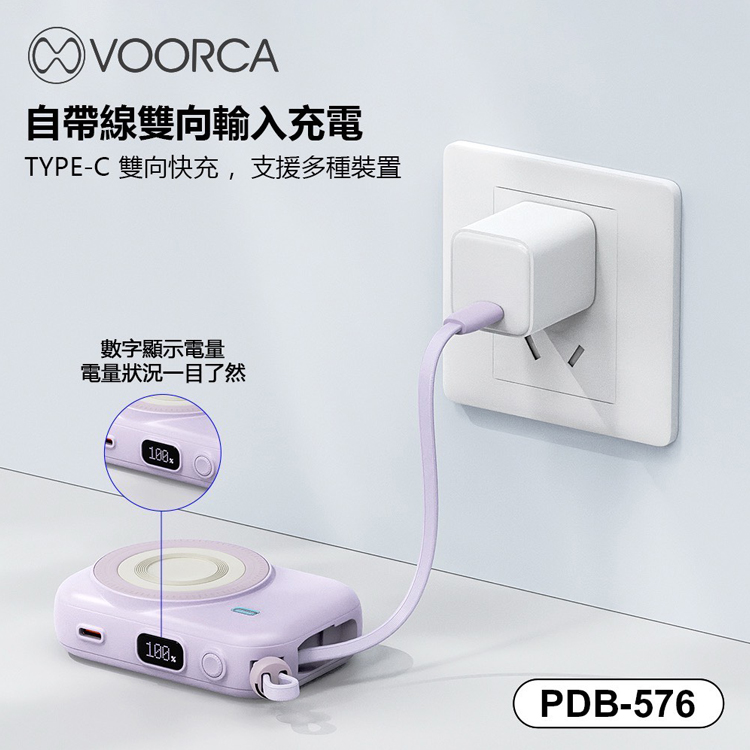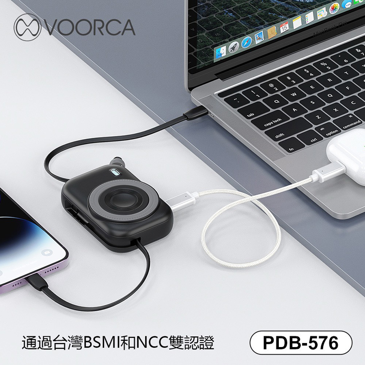 VOORCA PDB576 10000mAh自帶雙線+3合1磁吸式無線充(可充Apple手錶+藍牙耳機)多功能行動電源-黑