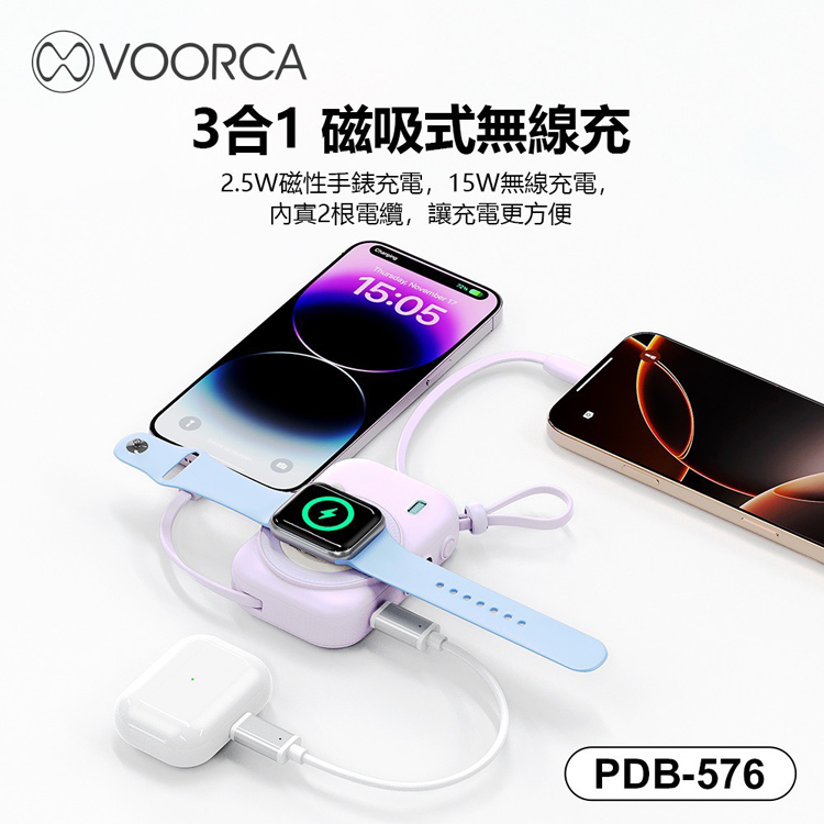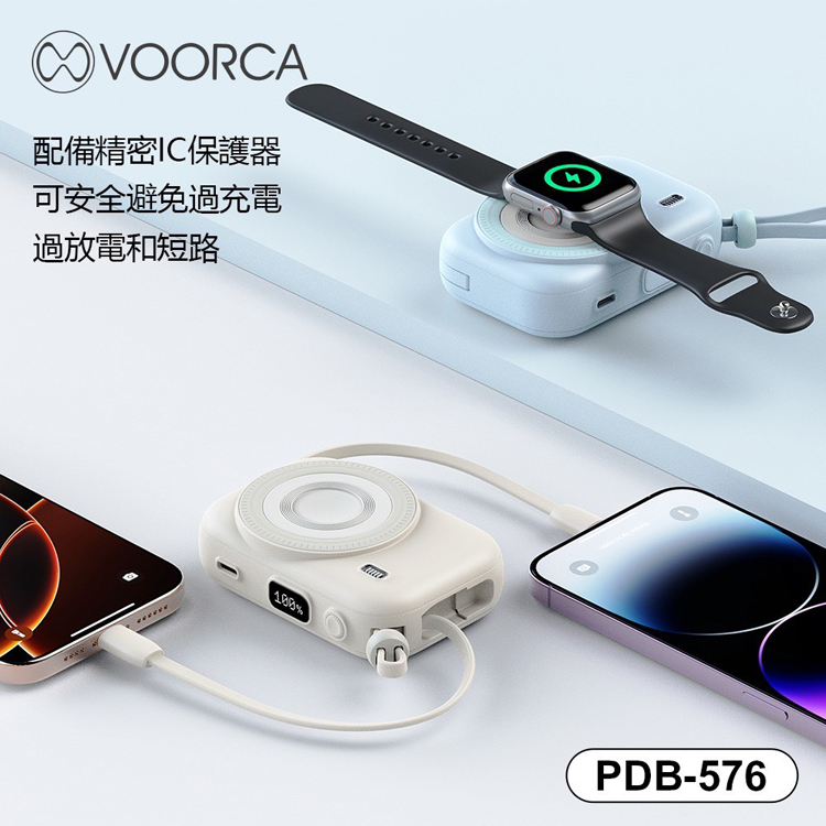 VOORCA PDB576 10000mAh自帶雙線+3合1磁吸式無線充(可充Apple手錶+藍牙耳機+手機)多功能行動電源-黑