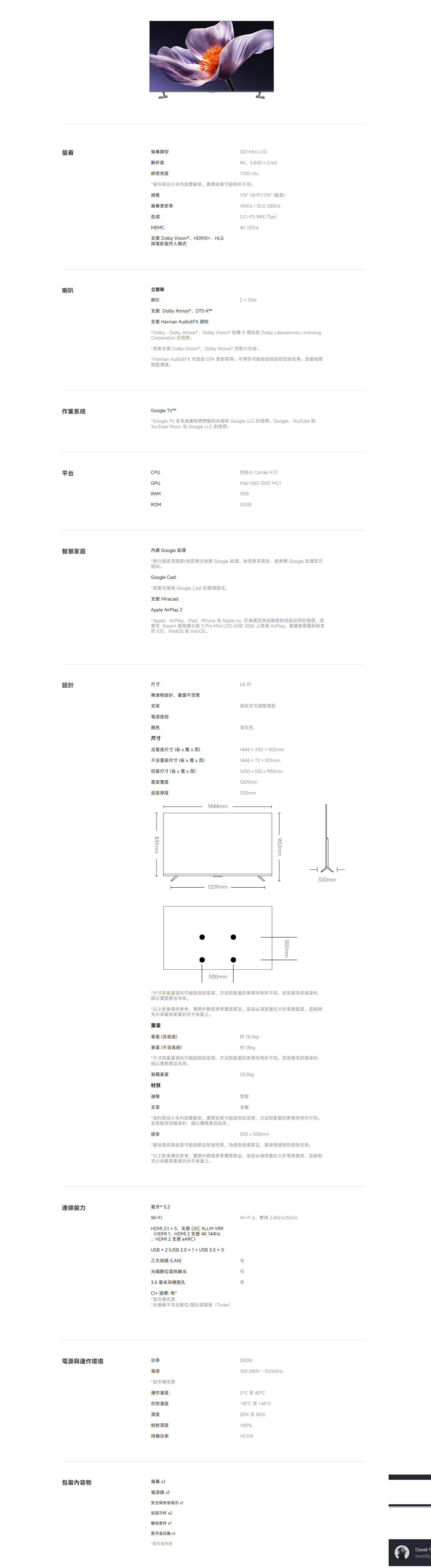 【新品上市】 小米 Xiaomi S Pro Mini LED 2026 65型 智慧顯示器