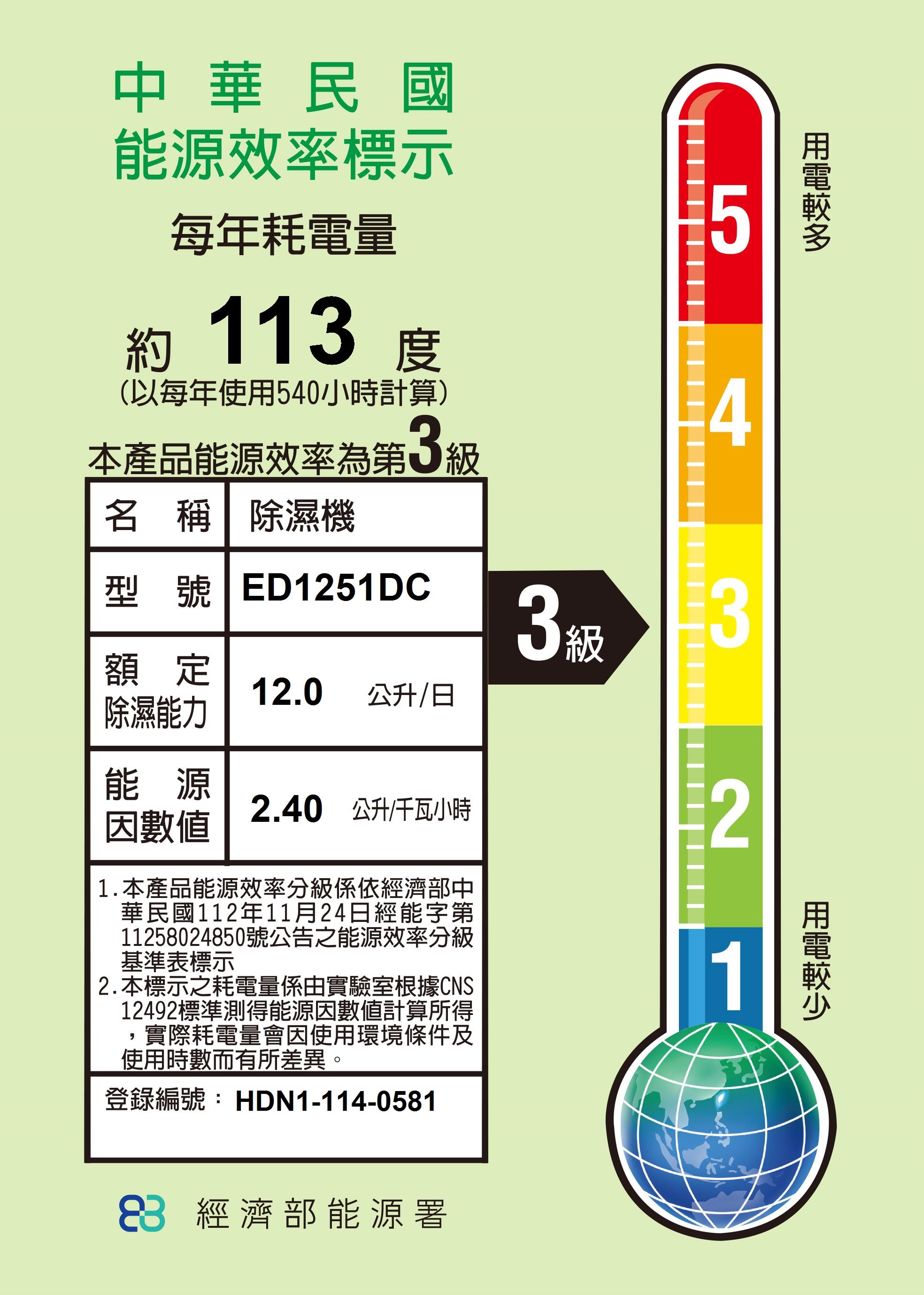 ★日除濕力: 12公升/日、除濕適用坪數: 15坪